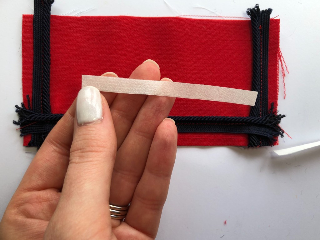 Peel off only one side of the paper and place the steam-a-seam adhesive side down where the petersham ribbon will go. I like to center the steam-a-seam on the fabric and the trim to have more contact with more layers of fabric. Iron it into place.