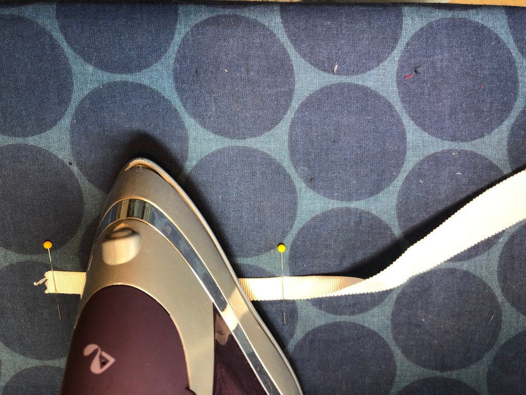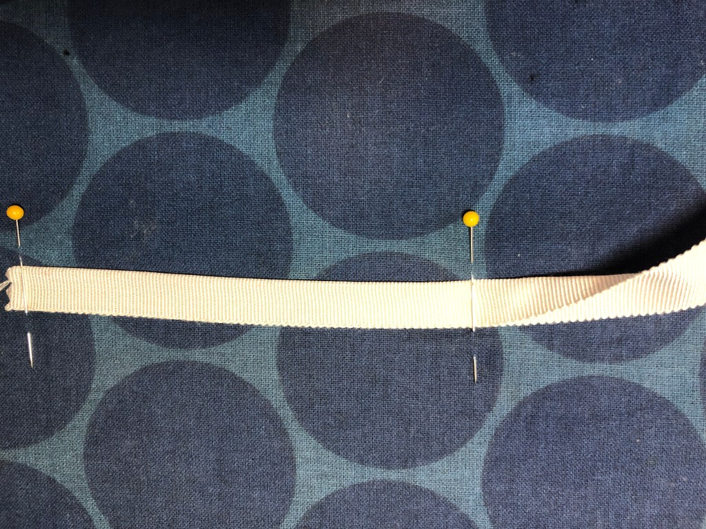 Fold the petersham in half and iron. I like to use this hack that I use when I make bias tape. I take straight pins and pin them into my ironing board to form 1/2″ “slots” that I pass the ribbon through. My iron fits in the middle, and I can set the iron down and pull the ribbon through with minimal effort to make sure the fold is actually in the middle of the ribbon.